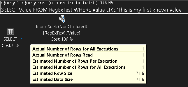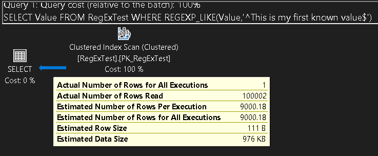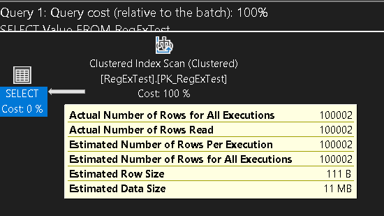 Easy enough, the estimate was 100002, and the actual was 100002. It did a Clustered Index Scan, which was interesting (and why I tried to increase the data to be a lot larger, but since I am only using the Value column, I sort of expected it to scan the Value index). It is a very small record size for each row, so that may be affecting the plan.